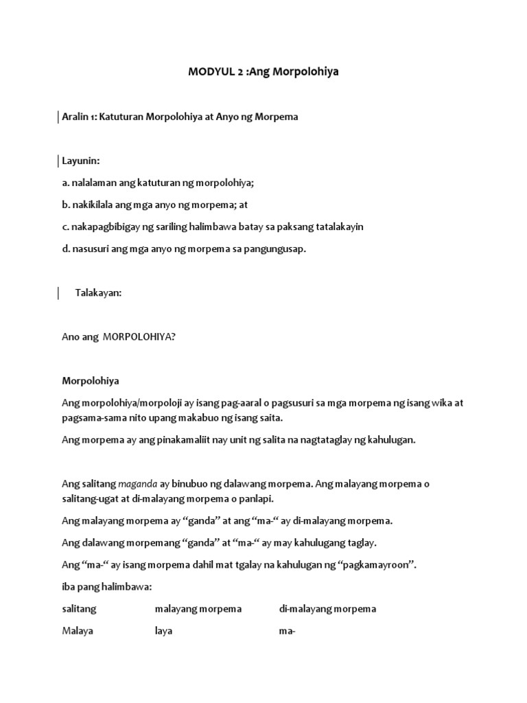 Ang morpema ay maaaring isang salitang-ugat o isang panlapi. ARALIN 1 MGA INAASAHAN SA ARALIN. Banggitin muna nating muli rito na konsistent ang palabaybayan ng Filipino- kung ang bigkas ay siyang sulat.