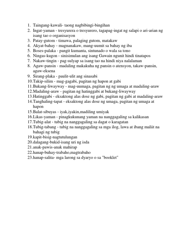 This 2-page pdf worksheet has 25 items. Taingang-kawali- taong nagbibingi-bingihan 2. Dalawang Uri ng Tambalang Salita.