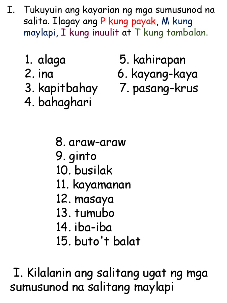 Chaka Hindi maganda Not pretty. Magbigay na sampung halimbawa ng payak na salita. Inuulit ang buong salita o bahagi ng salita ay inuulit.
