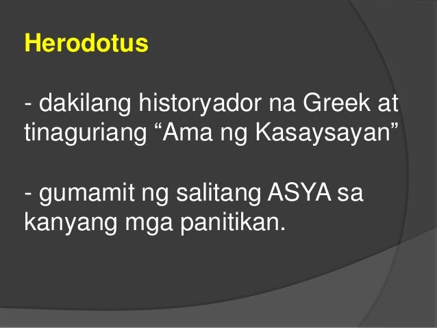 Herodotus KAHALAGAHAN NG PAG-AARAL NG KASAYSAYAN NG ASYA Una ang mga Pilipino ay Asyano. Ang Asya ang pinakamalaking kontinente sa buong daigdig. Ang The Histories ay isang walang-kupas na obra maestra sabi ng isang makabagong manunulatMababasa rito hindi lang ang kasaysayan kundi pati na.