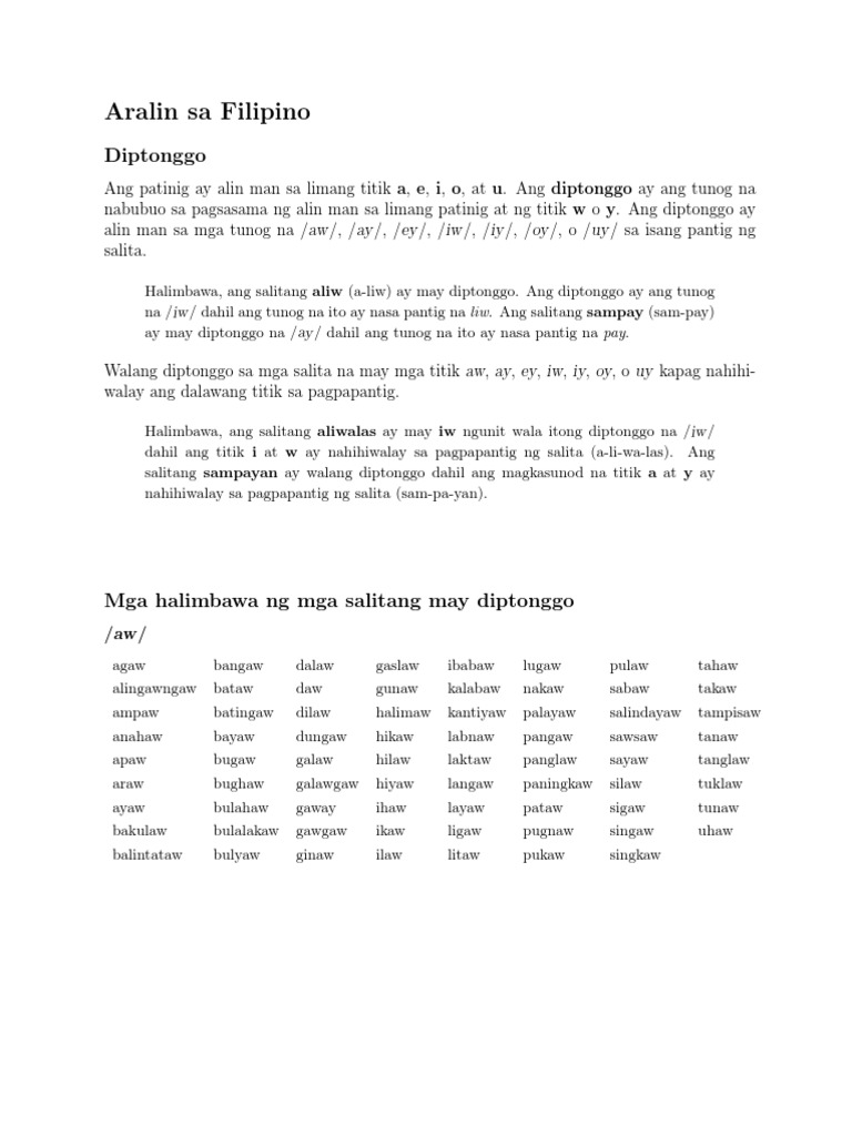 Aalis - a-a-lis Maaga - ma-a-ga Totoo - to-to-o 2. Ang mga alitang polyyllable ay ang mga may higit a apat na pantig. Isa sa mga araling itinatalakay sa mga maliliit na bata sa pre-school o elementarya ay ang diptonggo.