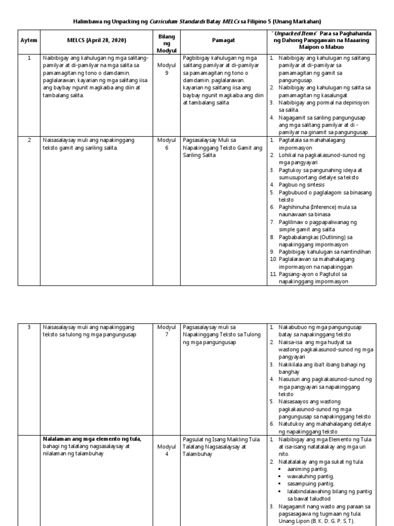 Halimbawa Ng Unpacking Ng Curriculum Standards Batay Melcs Sa Filipino 5