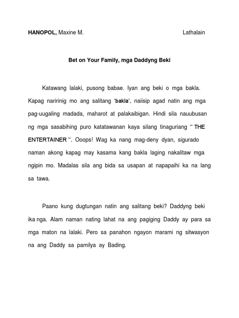 Sa katunayan hinahangaan ko ang mga taong tuwirang nakapaglalahad ng kanilang ideya at saloobin gamit ang wikang ito. May mga ibang grupo naman na ang gamit ay ang mga makabago at naimbento lamang ng mga salita.